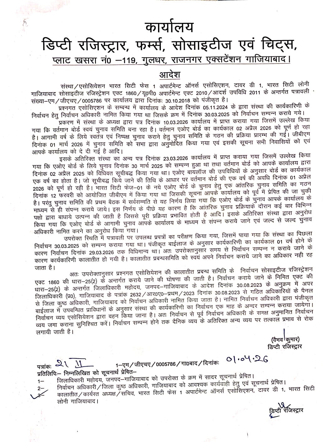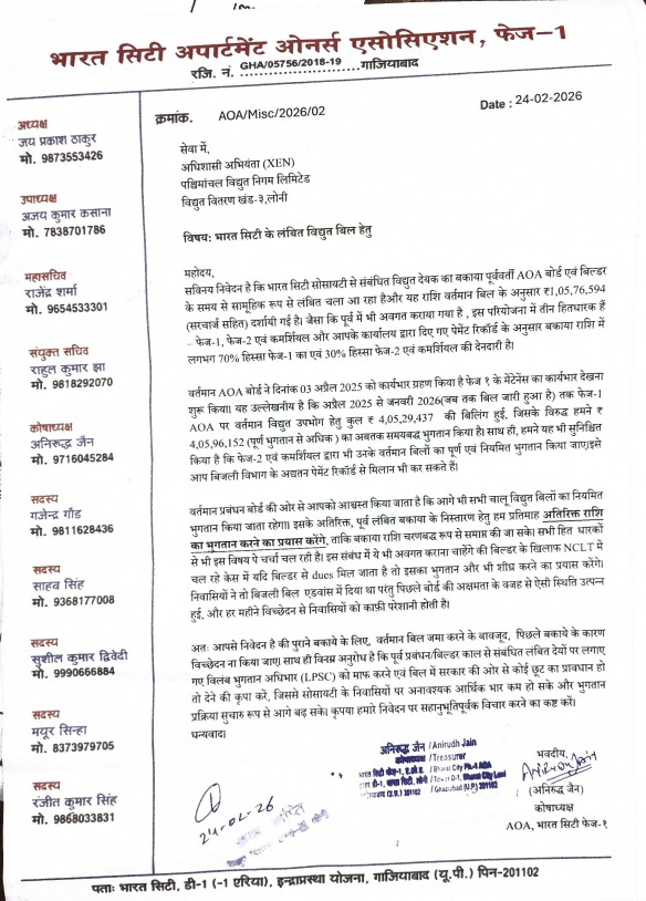 आज, दिनांक 1 अप्रैल 2026, हमारे भारत सिटी फेज-। अपार्टमेंट ओनर्स एसोसिएशन (AOA) के वर्तमान प्रबंधन बोर्ड का एक वर्ष पूर्ण हो गया है। वर्ष 2025 में, 2 अप्रैल को माननीय उप-पंजीयक (Deputy Registrar) कार्यालय द्वारा वर्तमान बोर्ड को विधिवत अधिसूचित किया गया था, और तब से लेकर आज तक हम सभी ने मिलकर भारत सिटी के बेहतर भविष्य के लिए निरंतर प्रयास किए हैं।