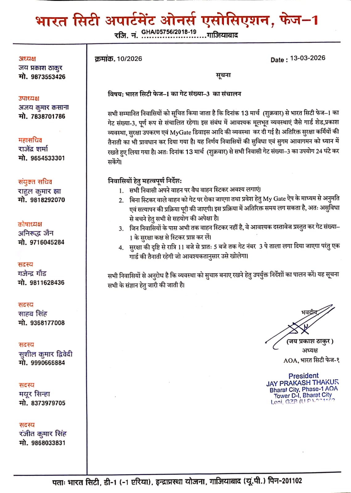 आज दिनांक 13 मार्च से भारत सिटी गेट संख्या-3 का संचालन पूर्ण रूप से शुरू किया जा रहा है। सभी निवासियों से अनुरोध है कि अपने वाहनों पर सोसायटी वाहन स्टिकर अनिवार्य रूप से लगाएं, अन्यथा प्रवेश के समय MyGate ऐप के माध्यम से सत्यापन किया जाएगा।